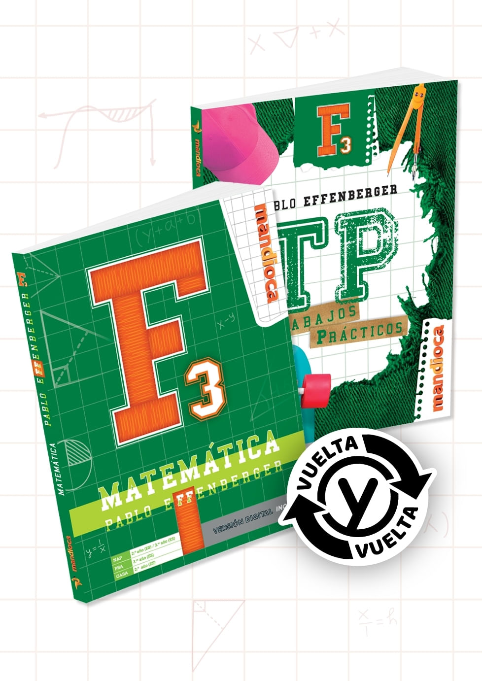 MATEMATICA F3 - ES 2 3 DOS propuestas A - B en el mismo libro: A- En el cuerpo principal, se presentan y desarrollan los contenidos de cada año de la siguiente manera: Definiciones, clasificaciones, procedimientos y ejemplos que facilitan la comprensión de los temas. Registro de avance con preguntas básicas que permiten evaluar la comprensión de la teoría. Conexiones de contenidos de Matemática con saberes de otras áreas. Actividades relacionadas de manera secuencial. Pruebas