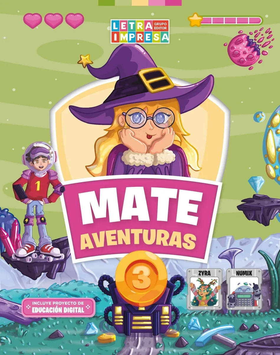 MATEAVENTURAS 3 En esta serie se aprieta "start" y comienza la aventura de aprender matemática jugando. Los y las estudiantes podrán recorrer mundos, desbloquear niveles y resolver desafíos matemáticos como si jugaran a su juego favorito. Dentro de los libros se incluye un Proyecto de Educación Digital, el cual sirve para trabajar el pensamiento computacional e iniciar a las y los estudiantes en la programación. Edad recomendada: A partir de 8 años.