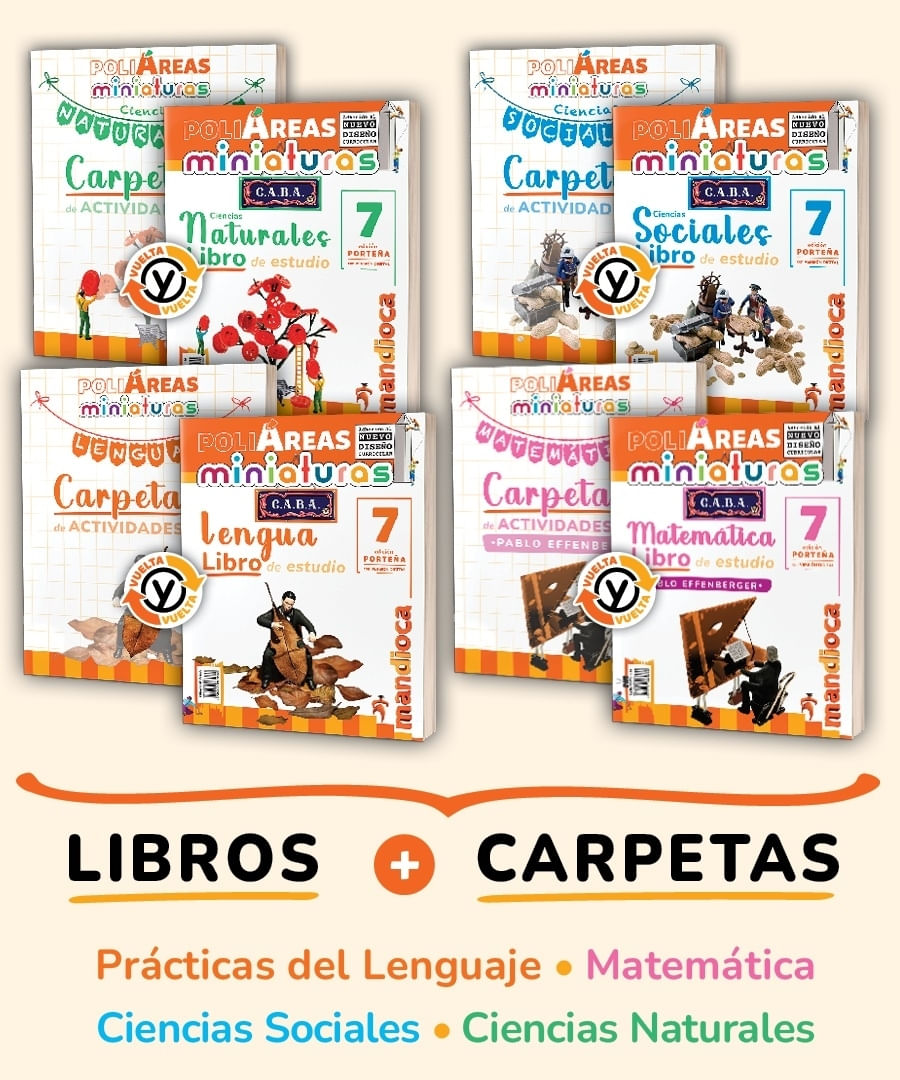 POLIÁREAS MINIATURAS 7 CABA - 4 TOMOS Organizado para su uso múltiple. LIBRO CARPETA de estudio de las cuatro áreas Lengua, Matemática, Cs. Sociales, Cs. Naturales . SOBRE LOS CONTENIDOS Lengua Textos literarios y no literarios de distintos géneros y tipos textuales. Teoría literaria. Información y actividades sobre el género literario del capítulo. Lectura Comprensiva LeC . Actividades organizadas por niveles de lectura. Ventanas especiales. Educación Digital, Educación Sexual I