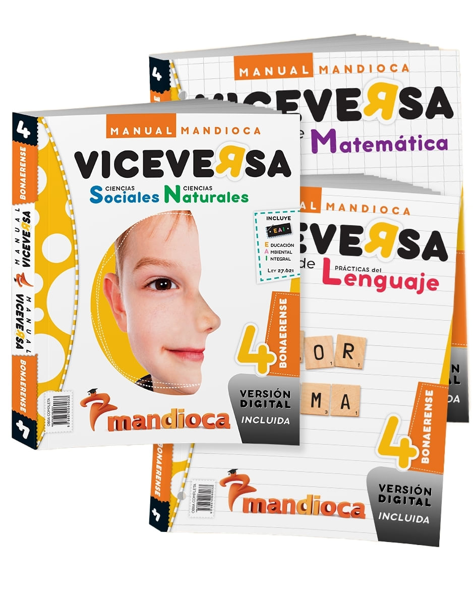 MANUAL VICEVERSA 4 BONAERENSE 2 TOMOS I LIBRO PRÁCTICAS DEL LENGUAJE CS. NATURALES SOCIALES. II CARPETAS DE MATE Y LENGUA Manual Viceversa propone un enfoque interdisciplinario que parte de saberes previos para construir conocimiento. El material propone reflexionar sobre la naturaleza del mundo y la organización de las sociedades a partir de hechos y datos curiosos que incentivan la experimentación, la observación y la formulación de ideas y conjeturas, puntos de partida para construir con